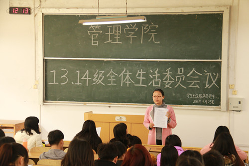 会议上,沈老师首先介绍了2016春季学期的学生社区管理工作重点,对学生宿舍管理工作进行了具体部署,并就学院推行的《管理学院学生宿舍管理制度》进行了解释说明。沈老师强调,宿舍是同学们的家,宿舍成员们要重视宿舍卫生和宿舍安全,学院也会加大对宿舍卫生和安全的检查力度,真正打造一个和谐健康的学生社区。之后,社管中心主任李佳兰带领与会人员认真学习了《管理学院学生宿舍管理制度》,并就接下来的每周一次院级宿舍卫生进行了具体安排。