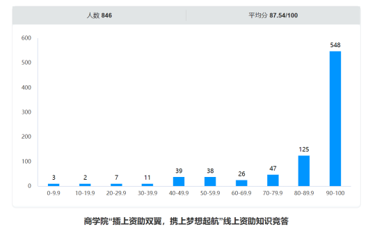 本次活动以线上答题的形式面向我院全体学生展开。竞答活动开始前,通过线上活动预热及时宣传;活动开始后,同学们积极响应,在学生群体中营造了学习了解资助政策知识的浓厚氛围。同学们参与热情高涨,积极答题,大家纷纷表示,竞答活动进一步加深了大家对国家资助政策的了解。本次资助知识线上竞答活动参与人数总人数846人,其中满分(100分)332人,90分以上达64.77%,及格率达88%,平均分为87.54分。